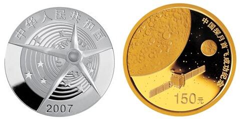 2007年10月24日18時05分,中國航天事業(yè)繼人造地球衛(wèi)星、載人航天后,又塑造了一個新的里程碑——探月工程。嫦娥一號探測器從西昌衛(wèi)星發(fā)射中心成功升空,并準確地進入了預定軌道。同年,中國人民銀行發(fā)行了中國探月首飛成功金銀紀念幣,在該套幣的背面圖案中,“嫦娥一號”正環(huán)繞著月球高速飛行,背景中坑坑洼洼的月球、點點繁星清晰可見,幣面遠景是我們人類的家園——地球。設計師采用不平衡的構圖方式,很好地增加了畫面的生動感和現(xiàn)代科技氣息,月球寫實,地球則相對抽象,這種視角上的獨特轉換,寓意中華民族的航天事業(yè)進入了一個嶄新的時代。