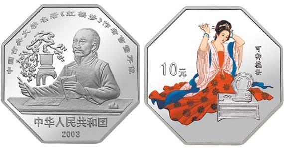 為銘記《紅樓夢》這部不朽的巨著,弘揚中國傳統(tǒng)文學,中國人民銀行于2003年7月28日發(fā)行了中國古典文學名著《紅樓夢》彩色金銀紀念幣(第3組)。該套紀念幣中的一枚1盎司彩色銀幣,正面圖案為《紅樓夢》作者曹雪芹像,背面為秦可卿梳妝圖。該幣將秦可卿優(yōu)雅的氣質,以及華麗動人的貴婦形象描摹得活色生香,意蘊悠揚。