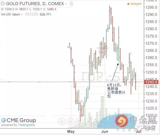 下圖為芝商所黃金期貨近月的走勢(shì),公布縮表計(jì)劃當(dāng)天,黃金期貨價(jià)格暴跌。