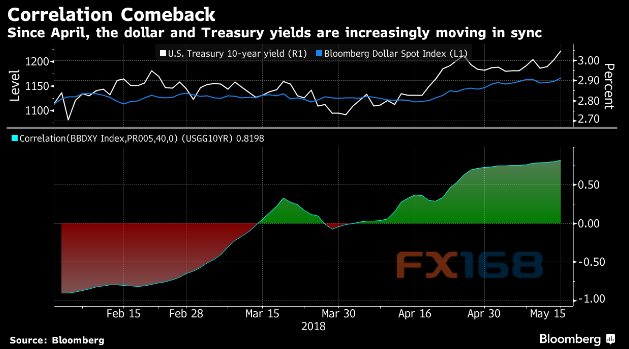 彭博撰文稱,過去的一個半月里,美債收益率和美元一直在穩(wěn)步上漲。相關(guān)性分析顯示,該趨勢與2018年第一季度恰好相反,當(dāng)時美債收益率與美元大體上背道而馳。相對穩(wěn)健的美國經(jīng)濟(jì)數(shù)據(jù),以及美聯(lián)儲似乎有望比其它央行更快收緊政策等因素都利好收益率走高和美元走強(qiáng)。