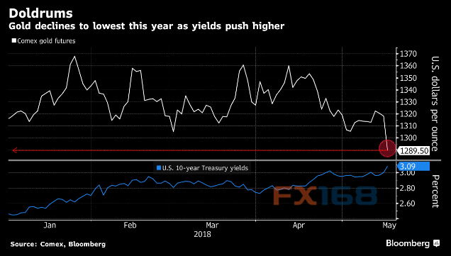 隨著美元達(dá)到今年最高,美國10年期國債收益率升至3%以上、為2011年以來的最高水平,金價終于跌破近期的波動區(qū)間。
