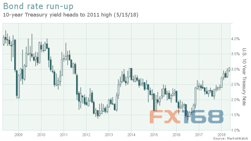 10年期美國國債收益率周二上升9個基點(diǎn),至3.091%,高于4月底的3.03%,為2011年以來的最高水平。兩年期國債收益率觸及2.589%高點(diǎn),為2008年8月11日以來的最高水平。