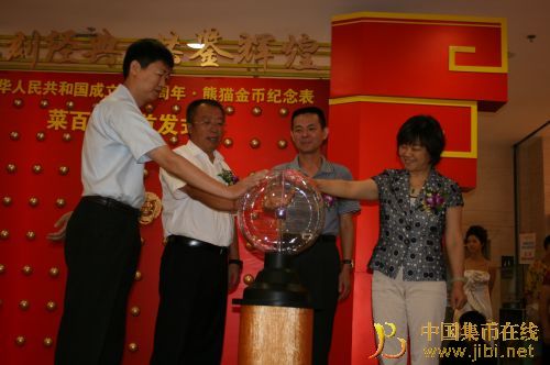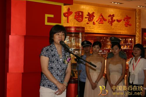 北京菜百總經(jīng)理王春利致詞,并向消費者介紹建國60周年熊貓金幣紀(jì)念表的優(yōu)勢與賣點等。
