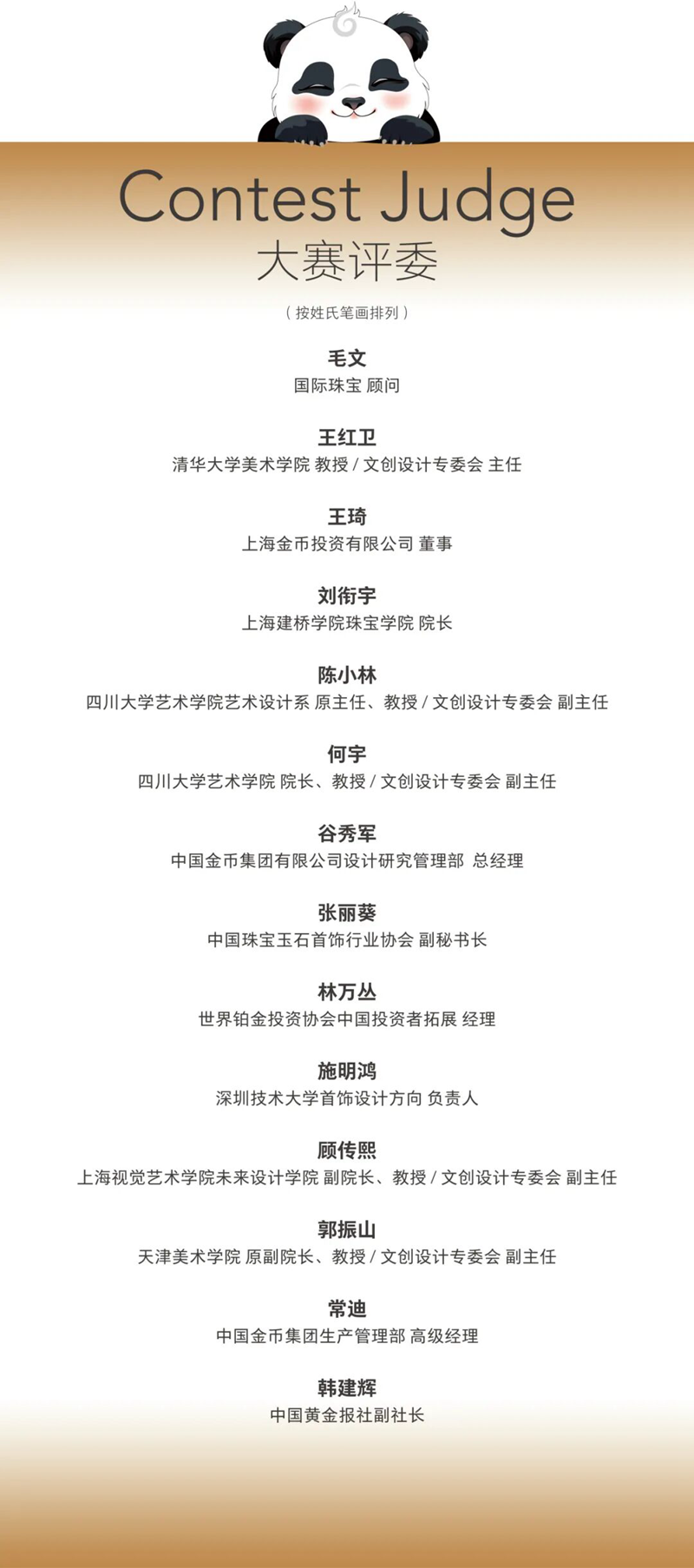 本次大賽評(píng)審活動(dòng)由中國(guó)金幣集團(tuán)有限公司主辦,中國(guó)民族民間工藝美術(shù)家協(xié)會(huì)文化創(chuàng)意設(shè)計(jì)專業(yè)委員會(huì)、中國(guó)珠寶玉石首飾行業(yè)協(xié)會(huì)首飾設(shè)計(jì)專業(yè)委員會(huì)指導(dǎo),四川大學(xué)藝術(shù)學(xué)院承辦,上海金幣投資有限公司、世界鉑金投資協(xié)會(huì)、中國(guó)黃金報(bào)社協(xié)辦。