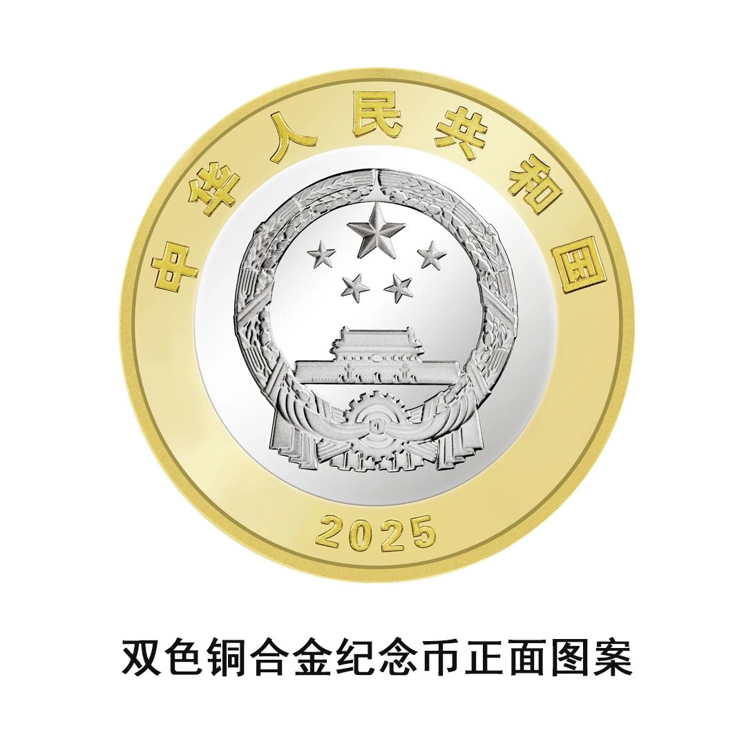 中國人民抗日戰(zhàn)爭暨世界反法西斯戰(zhàn)爭勝利80周年雙色銅合金紀(jì)念幣正面圖案為中華人民共和國國徽,國徽上方“中華人民共和國”國名,下方刊年號“2025”字樣。