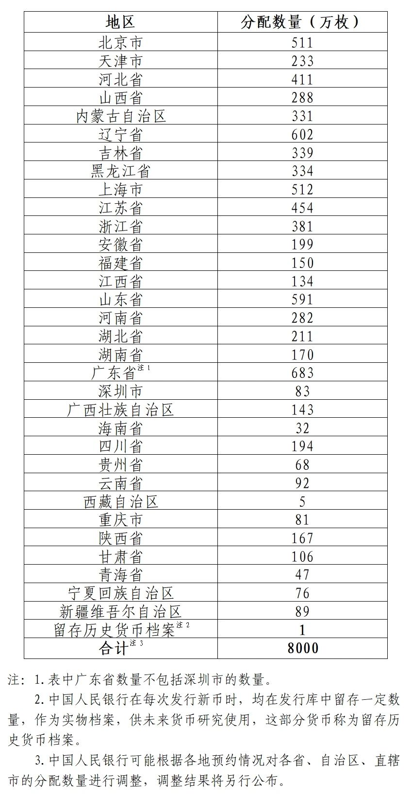 中國人民抗日戰(zhàn)爭暨世界反法西斯戰(zhàn)爭勝利80周年雙色銅合金紀(jì)念幣面額為10元,直徑為27毫米,材質(zhì)為雙色銅合金,發(fā)行數(shù)量為8000萬枚。各省、自治區(qū)、直轄市分配數(shù)量如下: