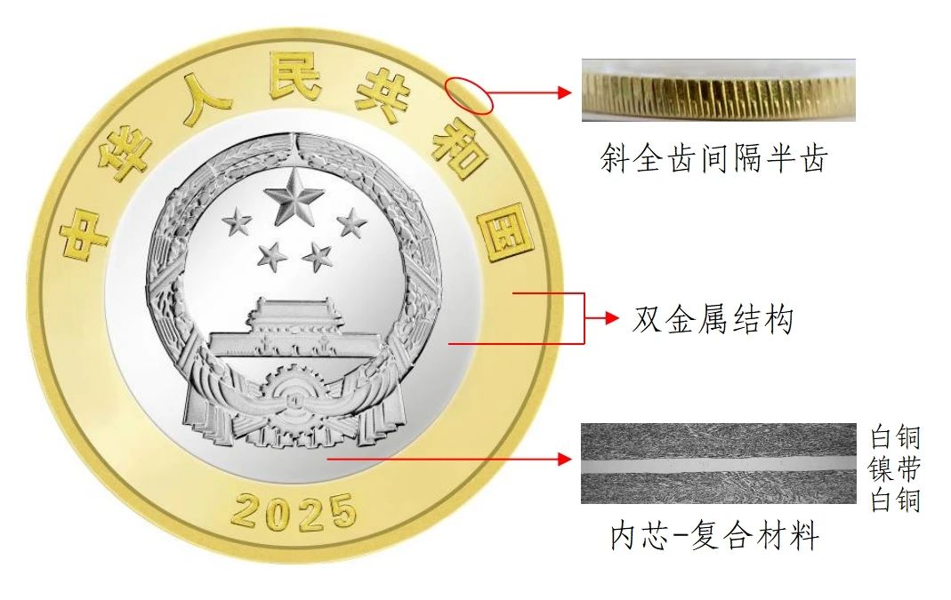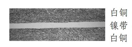 硬幣外環(huán)為黃銅合金,內(nèi)芯為具有獨(dú)特機(jī)讀性能的鎳帶復(fù)合白銅材料。內(nèi)芯復(fù)合材料防偽特征效果見圖1