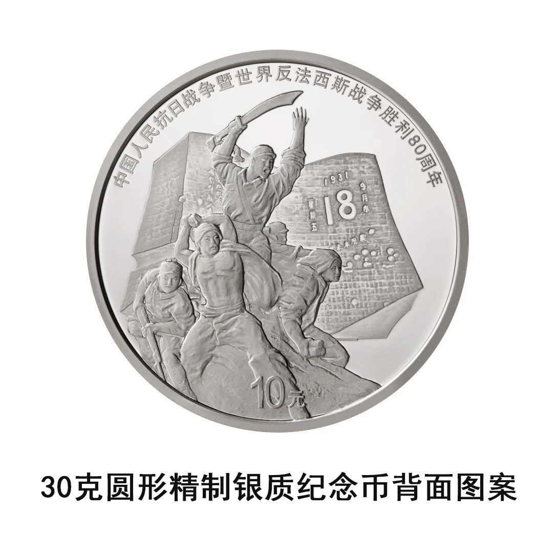 30質(zhì)紀(jì)念幣背面圖案“大刀進(jìn)行曲”雕塑、“九·一八”歷史博物館“殘歷碑”雕塑等元素構(gòu)成,并刊“中國人民抗日戰(zhàn)爭暨世界反法西斯戰(zhàn)爭勝利80周年字樣及面額“10元”字樣。
