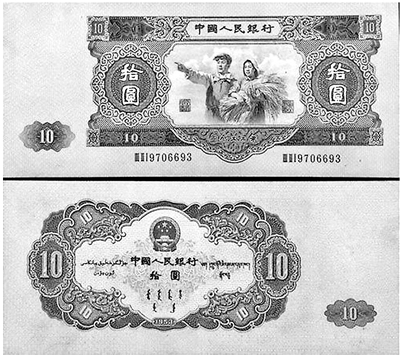 這張10元紙幣,長21厘米、寬8.5厘米,黑色,正面上方偏右側印著“中國人民銀行”六個大字,左右兩側各有一個大寫的“拾圓”,中間圖像為一男一女的工農形象;圖像下方標著“一九五三年”;背面的圖案是花紋和國徽,中間黃綠相間的底紋上分別印著漢、維、蒙、藏四種文字的“中國人民銀行拾圓”字樣,和其他人民幣不同的是,這張10元紙幣四邊都有較寬的白邊,除大寫“拾圓”上下方對稱部位分別印有阿拉伯數字“10”之外,在正面左側印有國徽水印的下方,還有一個阿拉伯數字“10”……