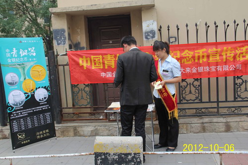 中國青銅器金銀紀念幣(第一組)上市以來,受到廣大消費者的認可,為了宣傳中國金幣品牌,更深入推廣中國青銅器金銀紀念幣(第一組)產(chǎn)品,2012年10月6日,北京全大來金銀珠寶有限公司組織工作人員在美立方小區(qū)開展新品宣傳活動。